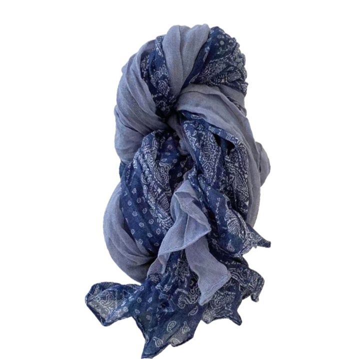 繊細なペイズリー柄と無地を組み合わせた切替デザインが魅力的なスカーフです。