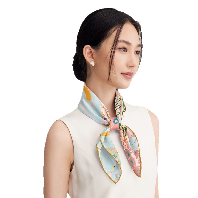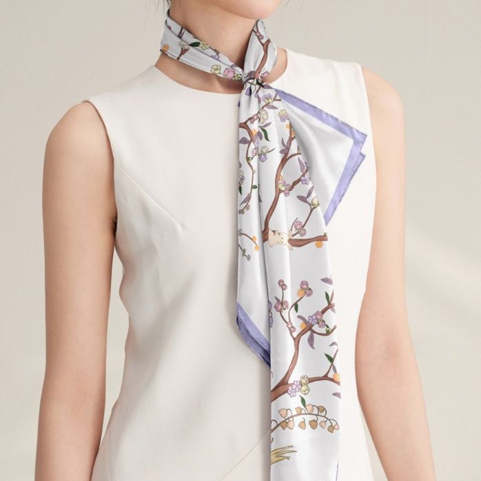 スカーフとして首元に巻くだけで、シンプルな装いを格上げし、洗練された印象を演出します。
