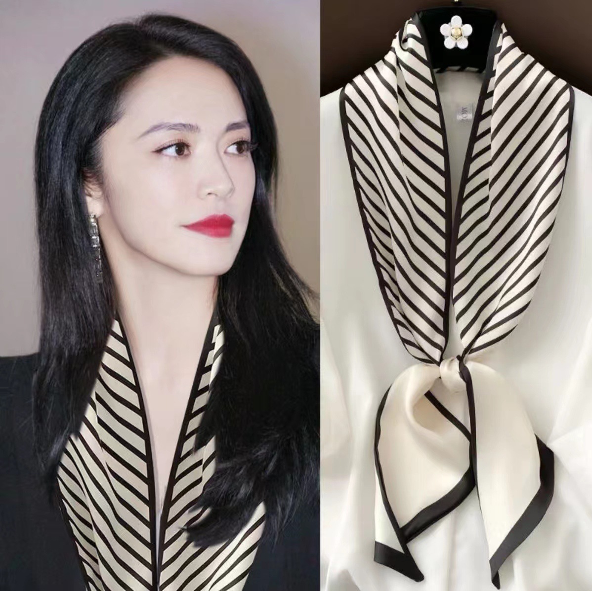 首元に垂らすだけで上品な雰囲気を演出でき、シンプルな装いのアクセントに最適なスカーフです。