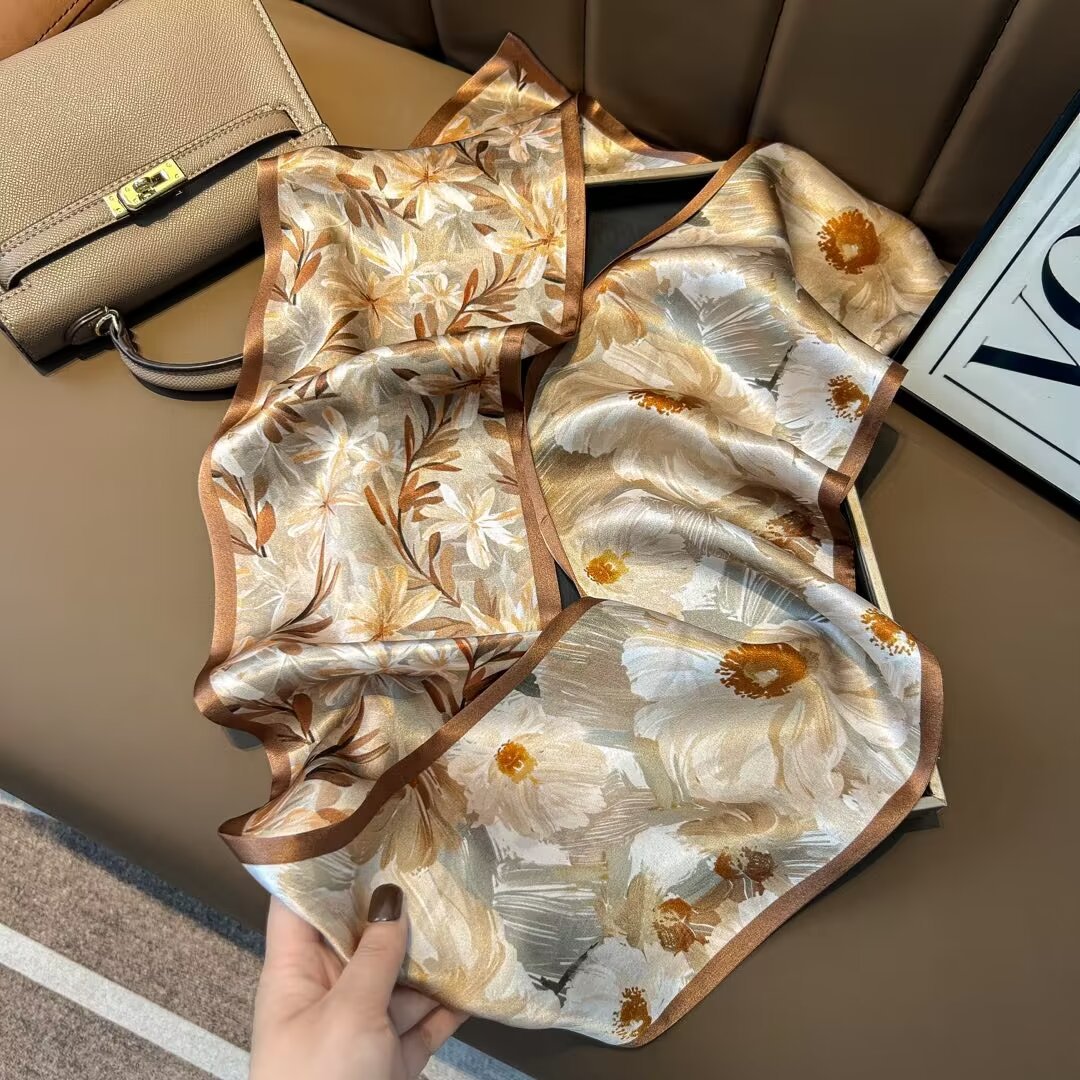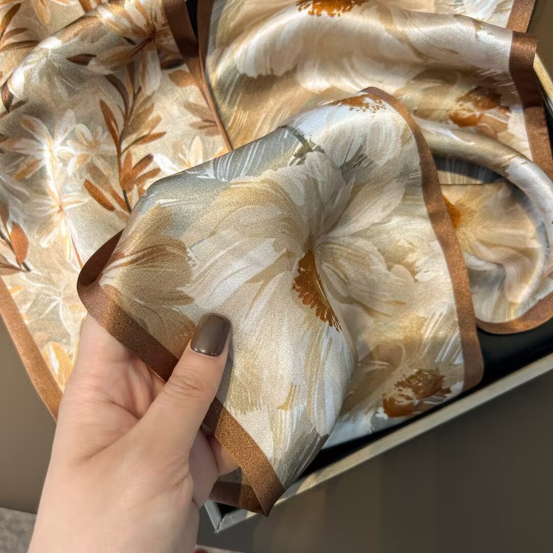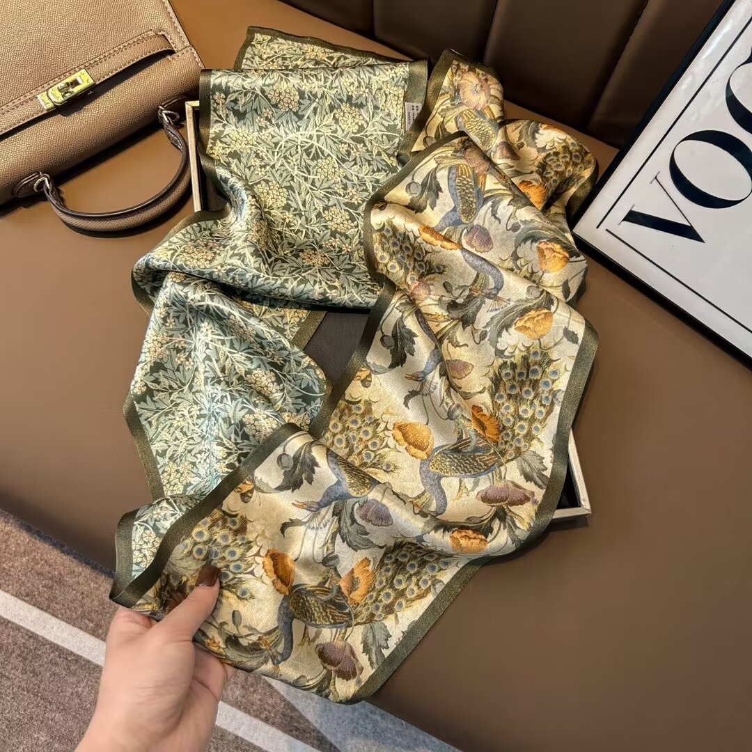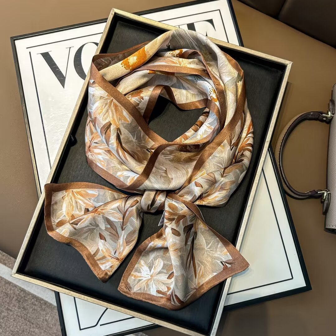 繊細な葉模様が美しく描かれた上品なシルクスカーフです。