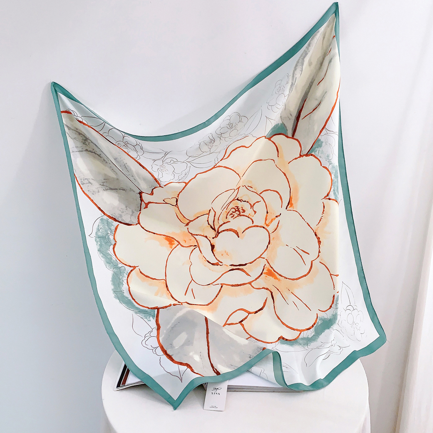 優雅な大輪の花を水彩画のようなタッチで描いた上品なシルクスカーフです。