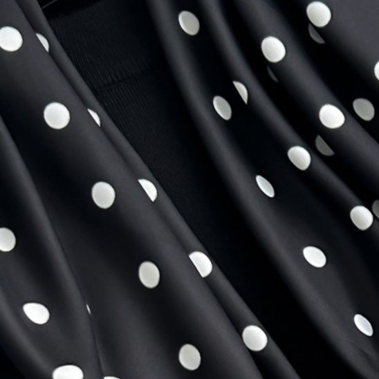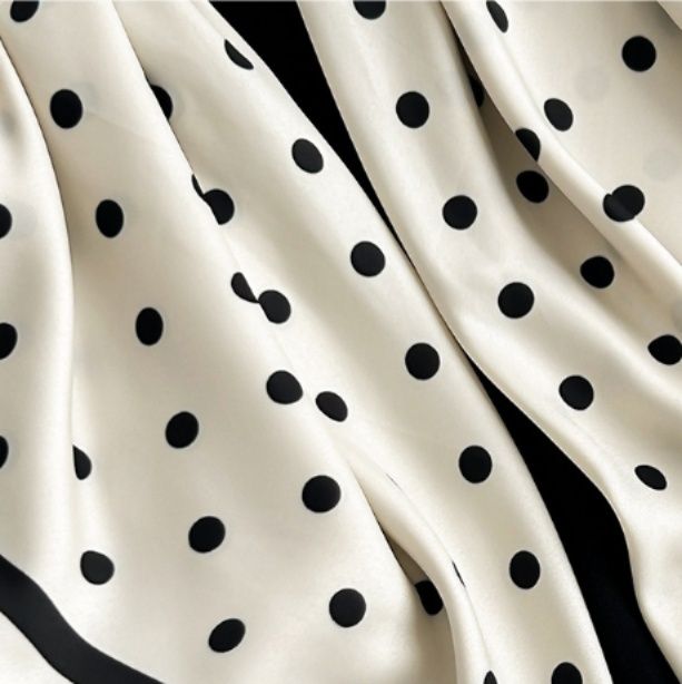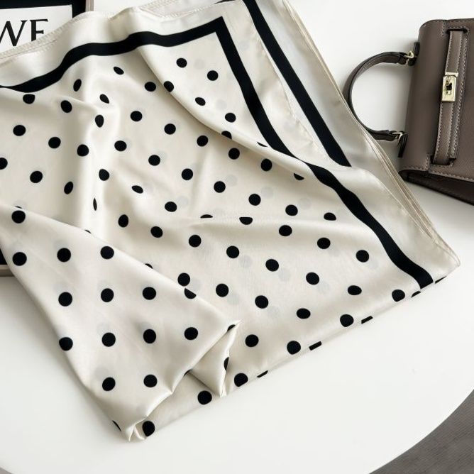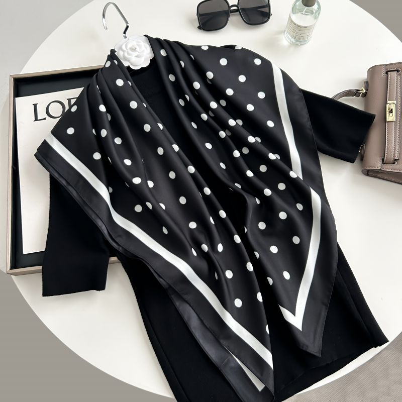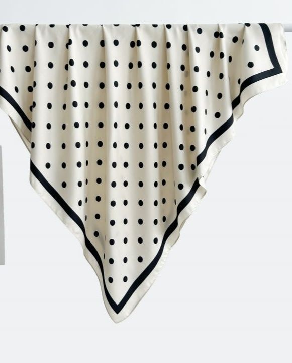 クラシカルな水玉模様が全体に散りばめられた、洗練されたデザインのシルクスカーフです。