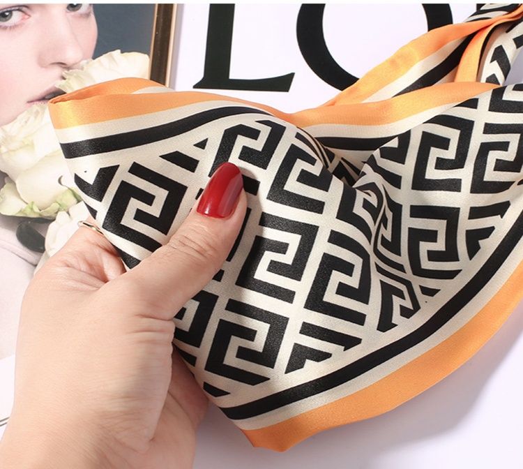 モダンな幾何学柄が印象的なシルクスカーフです。