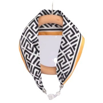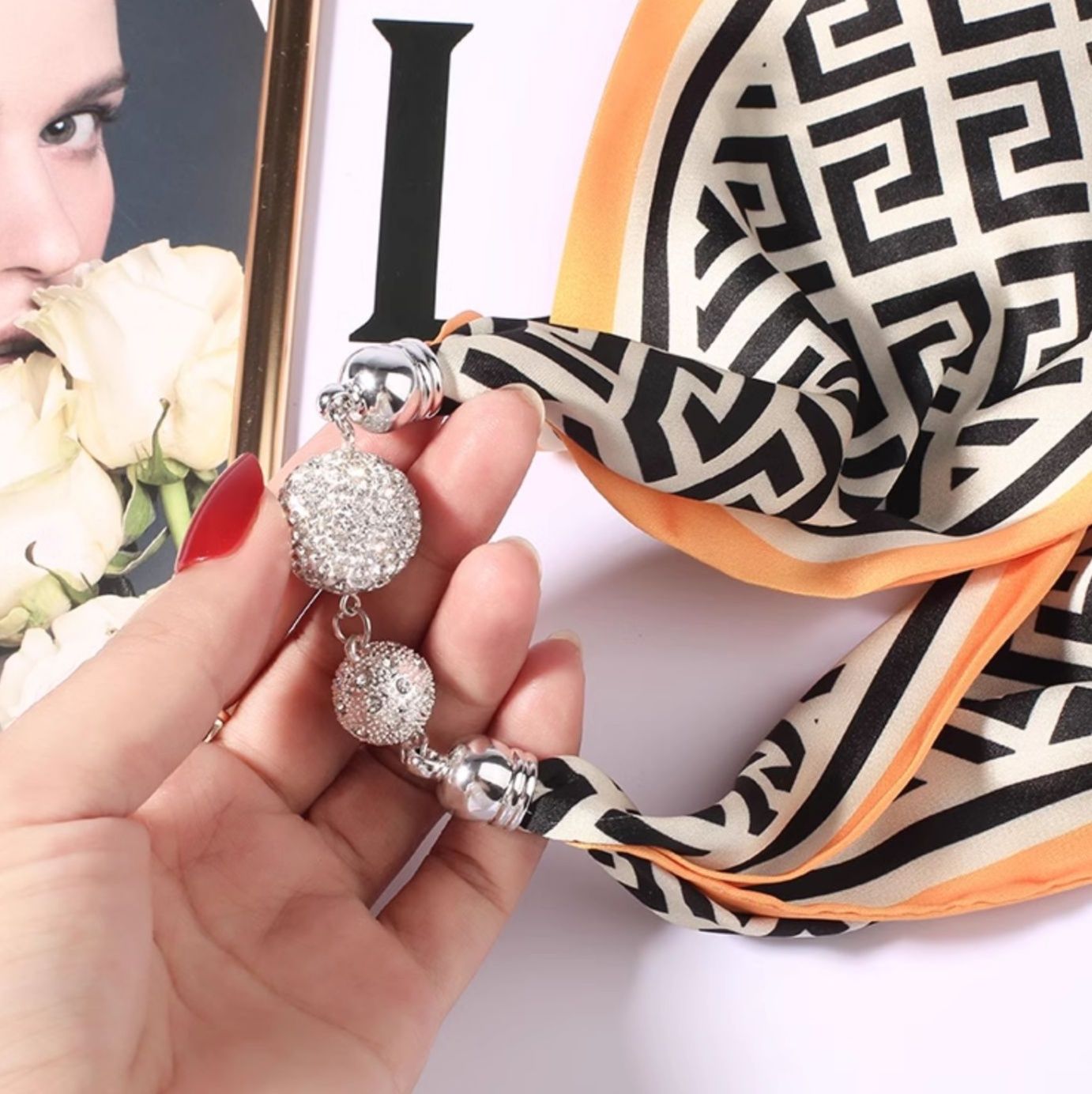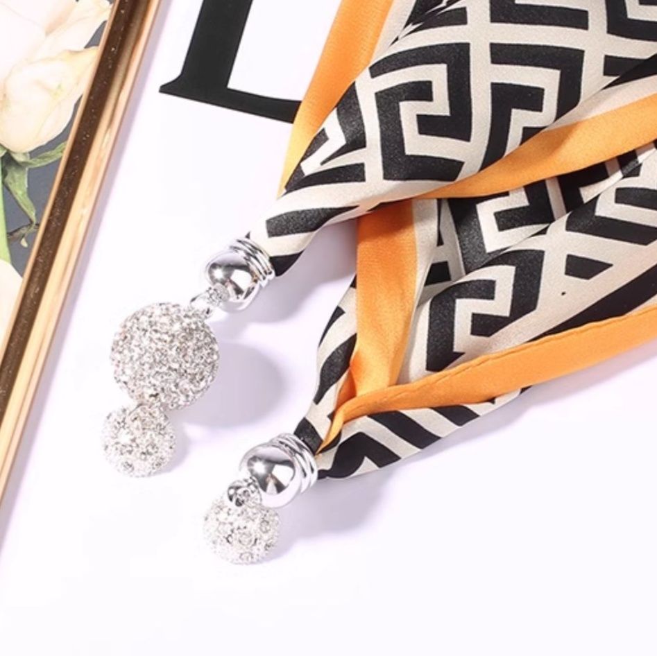パール風のチャーム付きで、スカーフを留めるだけでなく装飾性も高めています。